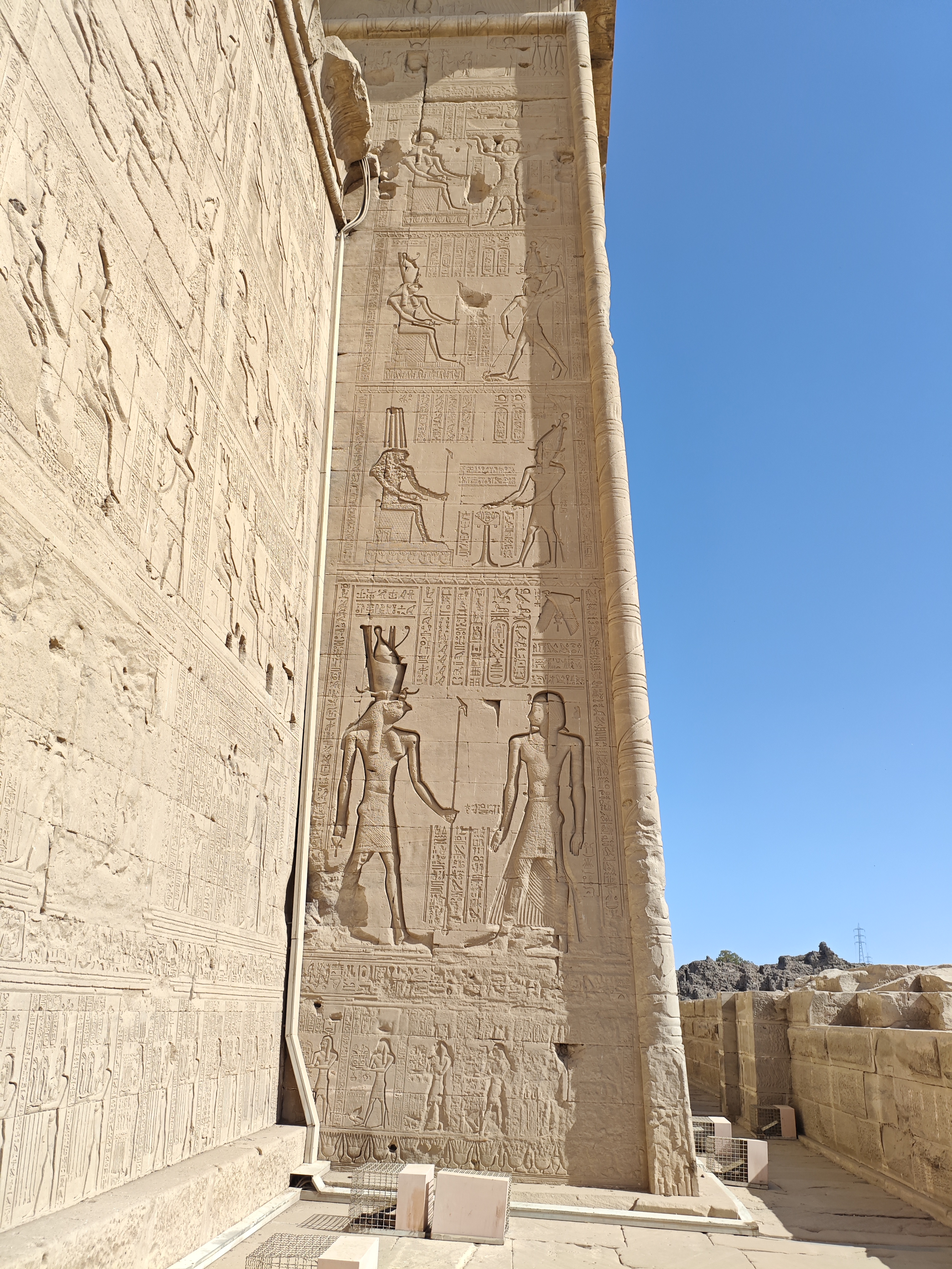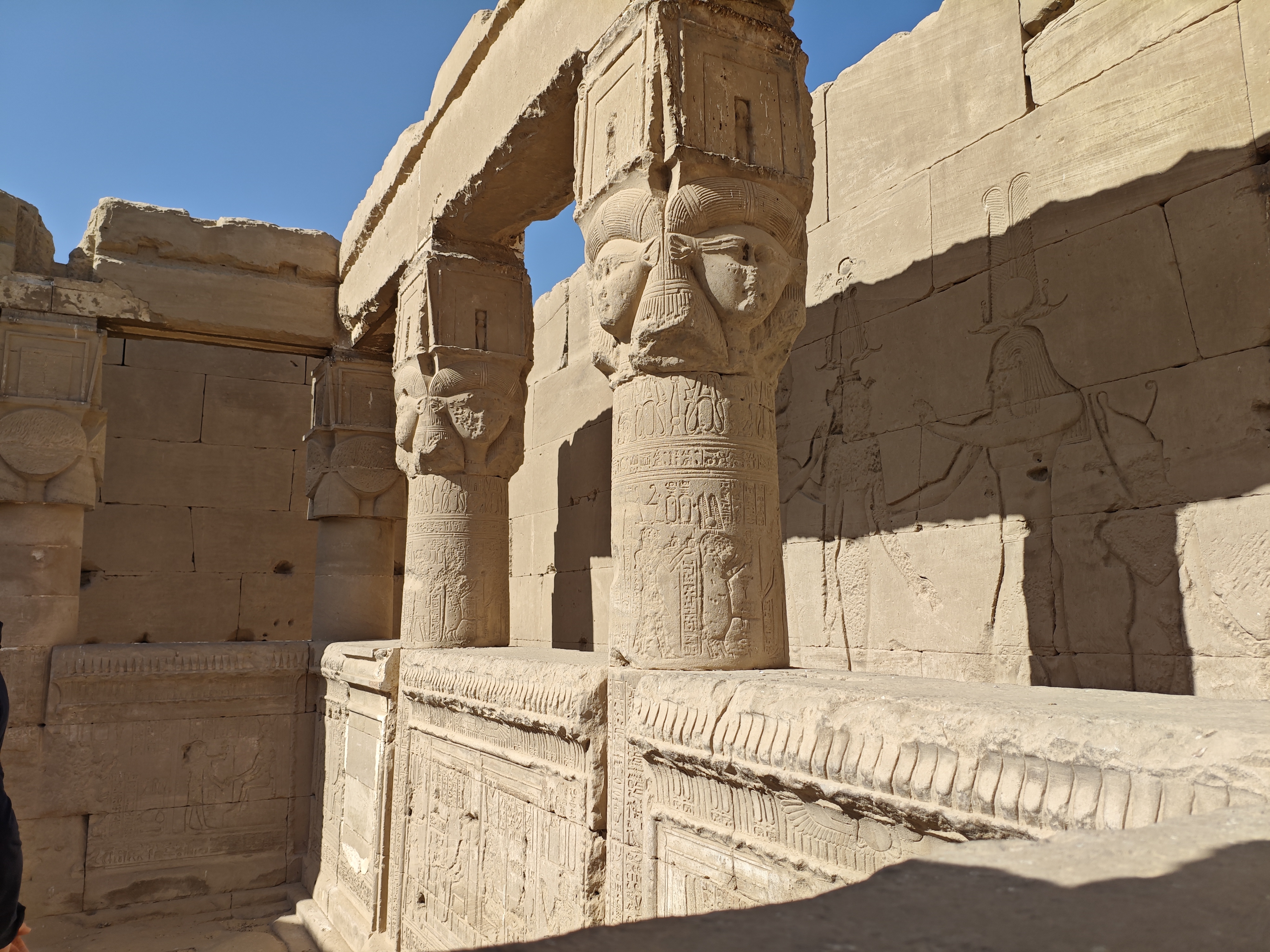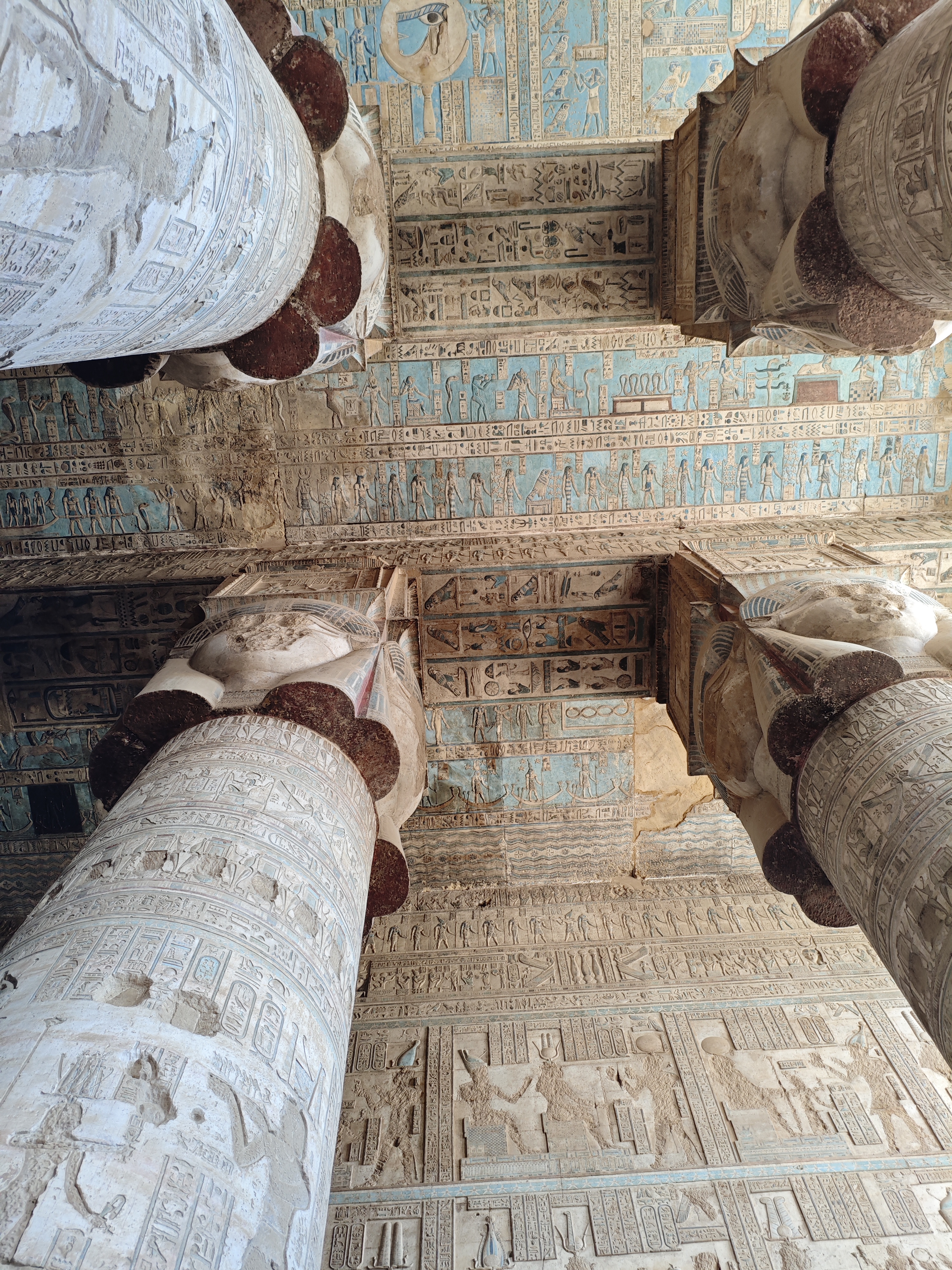 Reliefs und Inschriften: Die Wände des Tempels sind mit detaillierten Reliefs und Inschriften geschmückt, die Szenen aus dem Leben der Göttin Hathor sowie mythologische Darstellungen zeigen. Besonders bemerkenswert sind die Darstellungen der Geburt von Horus und die Zodiak-Szene, die den Himmel darstellt.